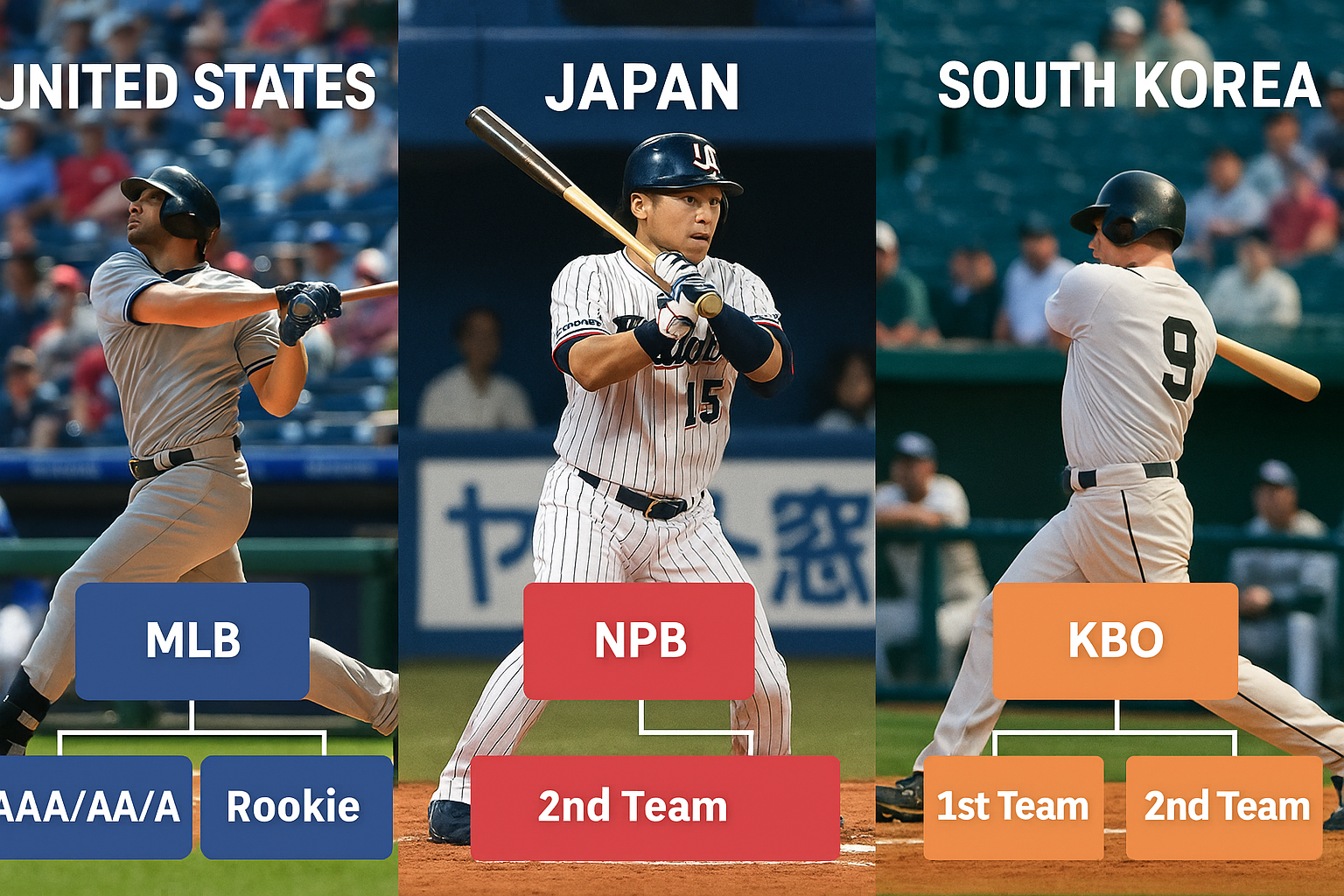 | 최상위 무대 | MLB (30팀) | NPB (12팀, 센트럴+퍼시픽) | KBO (10팀) |