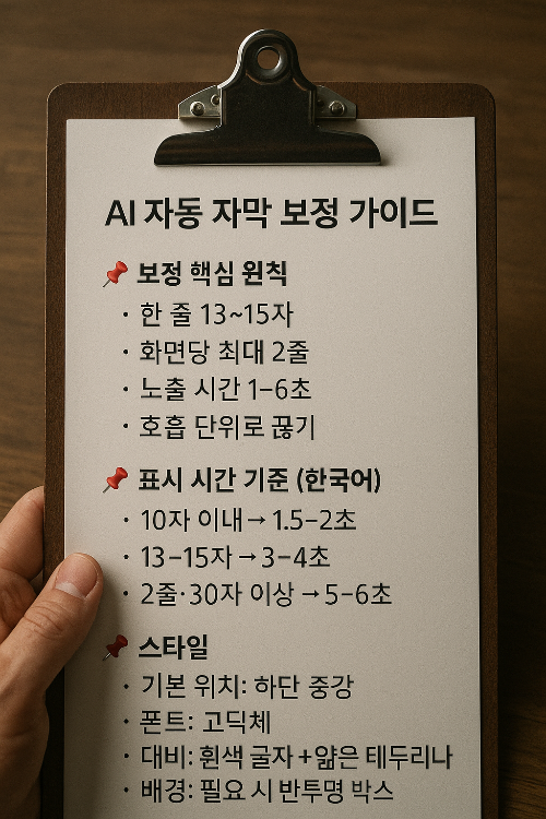 제가 정리한 AI 자동 자막 보정 가이드를 공유해봅니다. 이건 업계 표준 원칙을 제 경험과 요즘 영상 트렌드에 맞게 조정한 버전입니다.
