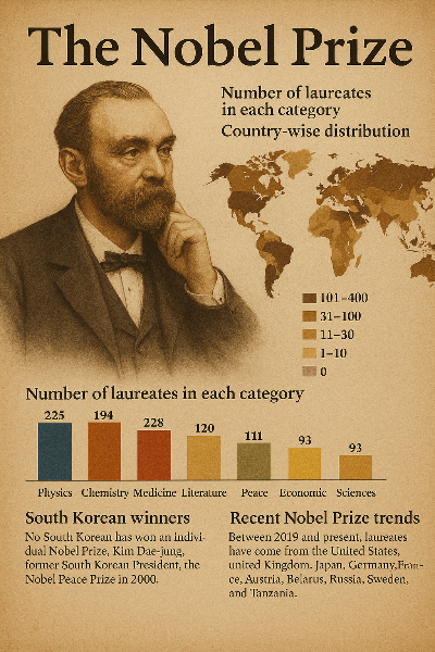 - 단, 이는 수상자가 중복될 수 있고, 기관(organization)에 수여된 경우도 포함한 수치입니다. (NobelPrize.org)
