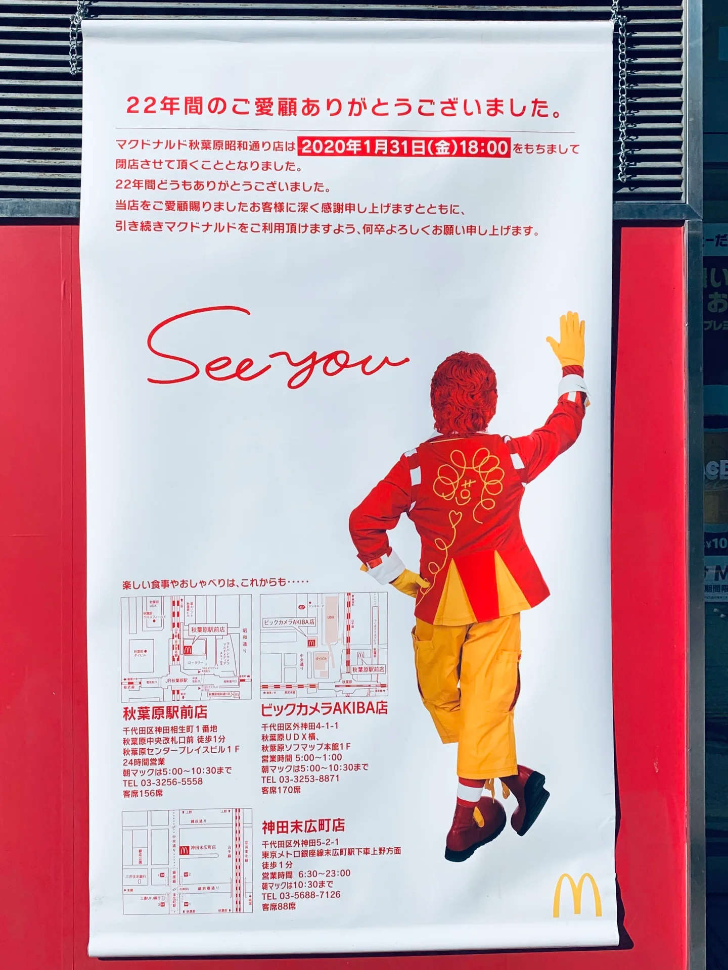 맥도날드 아키하바라 쇼와거리점은 2020년 1월 31일(금) 18:00부로