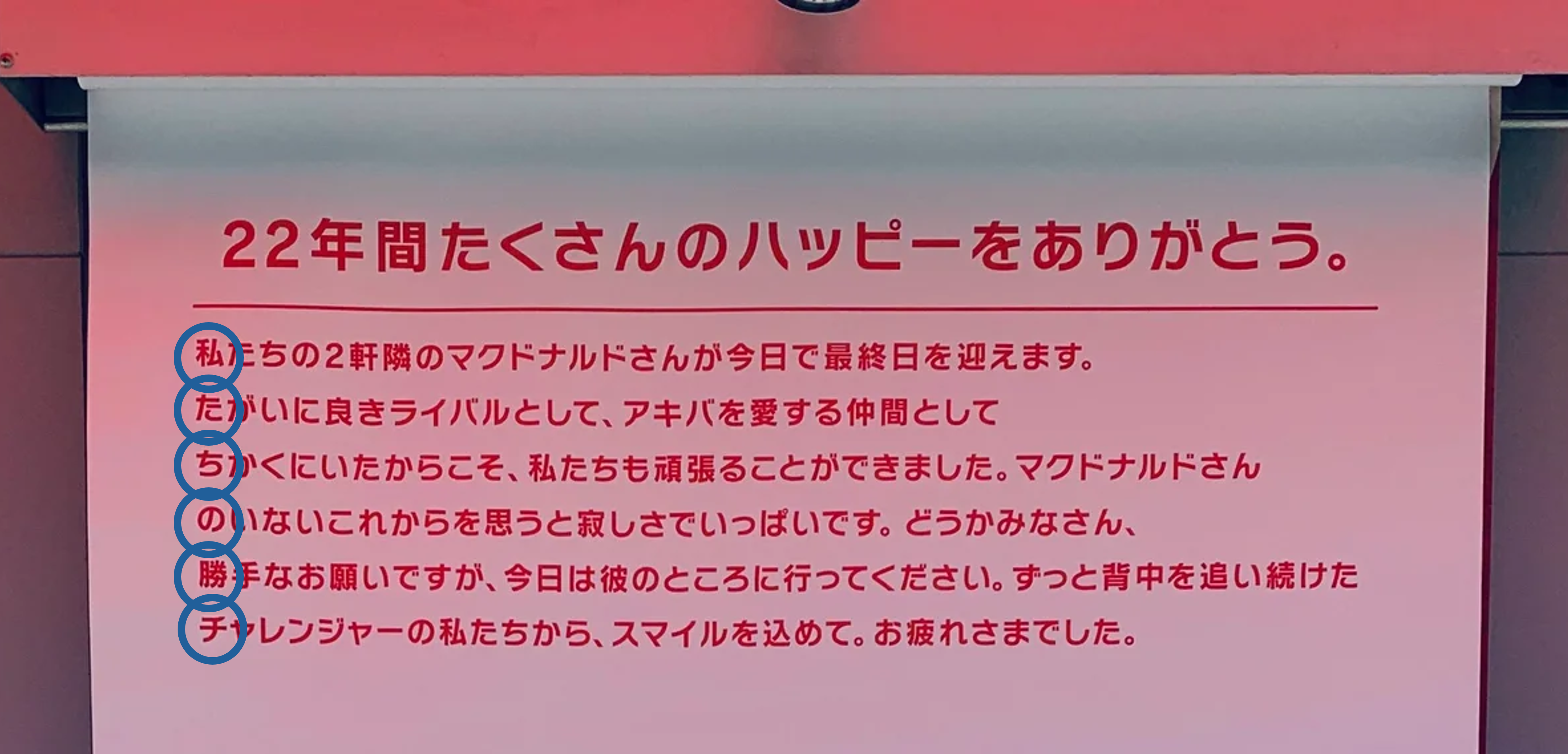 그 두 건물 옆, 라이벌인 버거킹 아키하바라 쇼와거리점 점포 앞에는 '22년간 많은 해피를 감사합니다'라고 쓰여 있는 광고에는 버거킹 유니폼을 입은 남성이 모자를 벗고 고개를 숙인 사진과 함께 'Thank You'라는 문자가 쓰여 있었습니다.